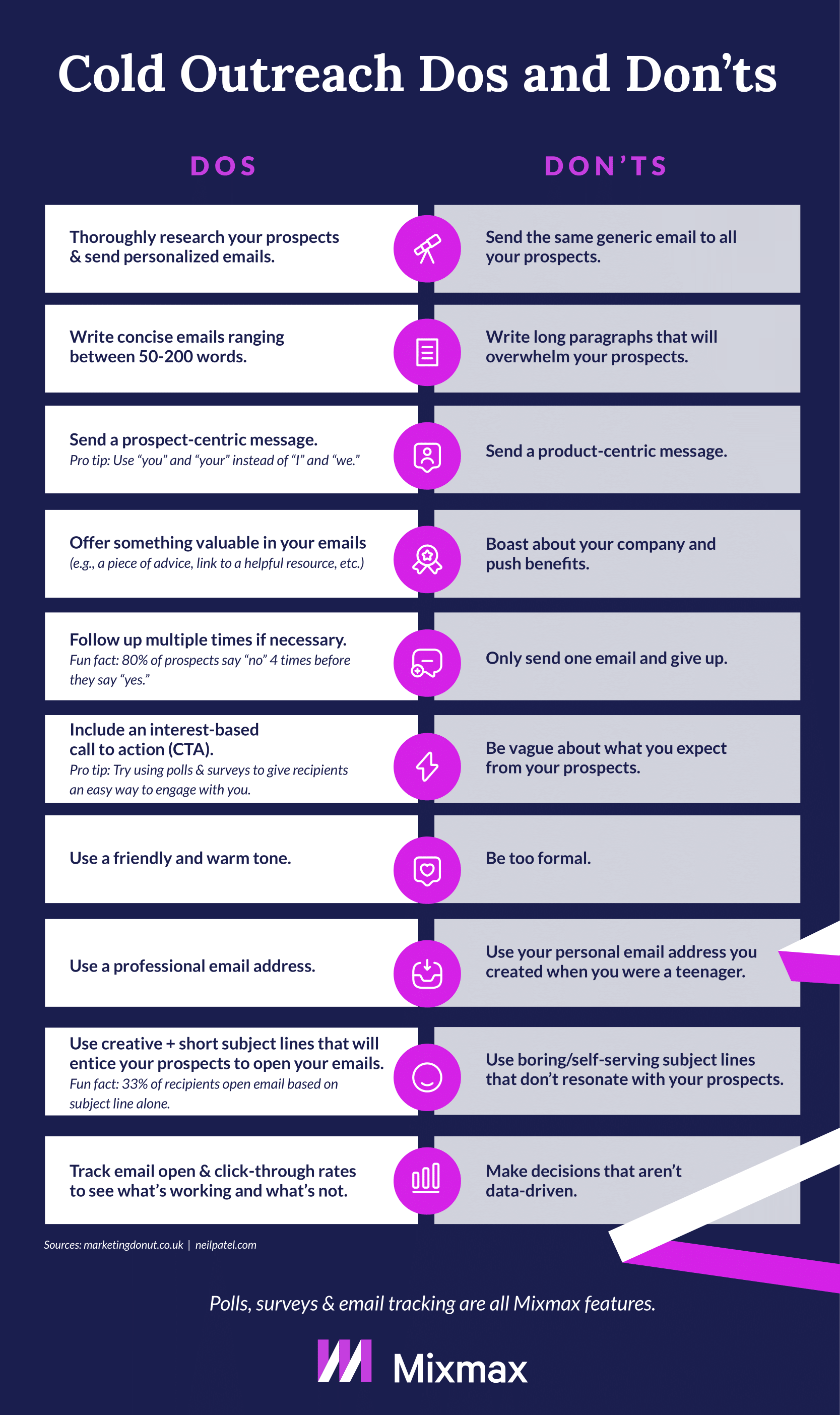 We’ve prepared an infographic that showcases 10 cold email best practices in a simple “dos and don’ts” format.