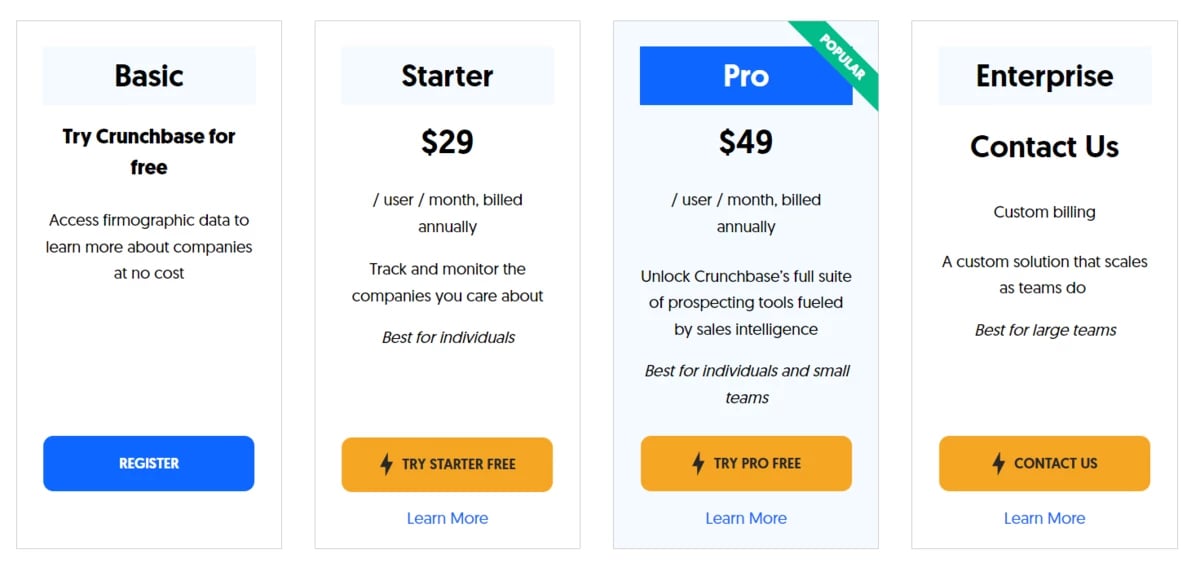 Crunchbase is an account-based sales intelligence tool that allows you to search in-depth information on companies in over 700 industries. Its human-AI team validates data submitted by a large community of investors, entrepreneurs, and executives, which you can search to unearth companies that match your ideal customer profile (ICP).